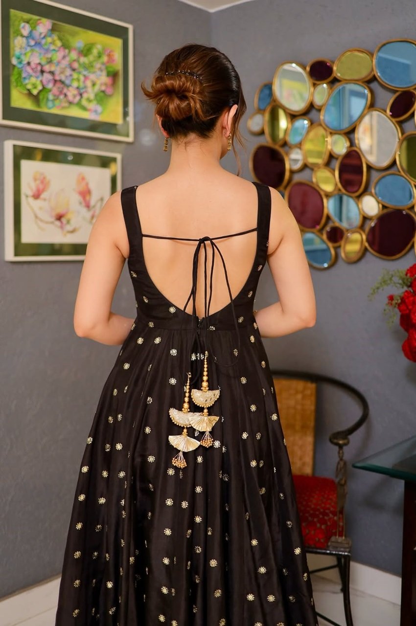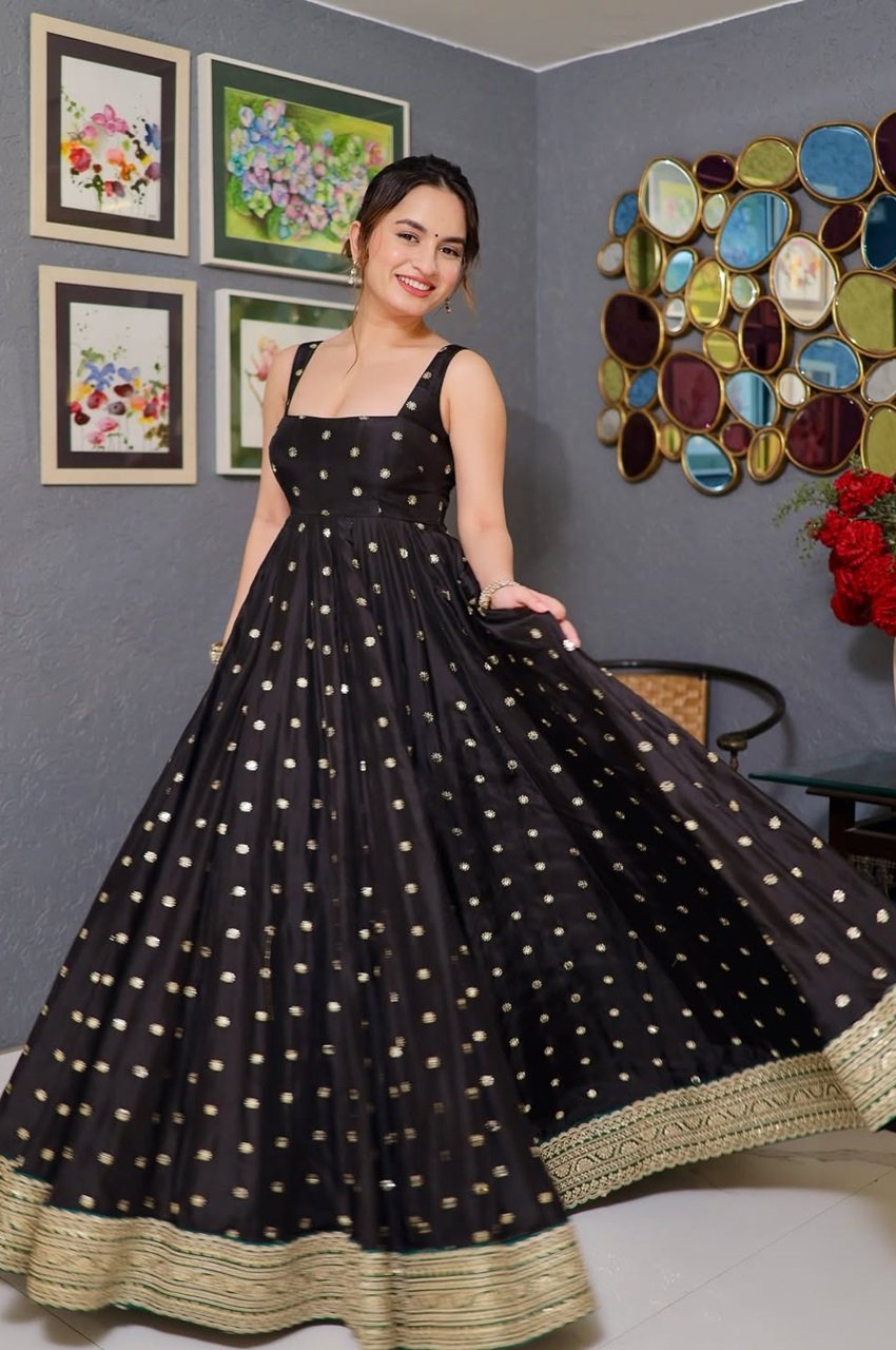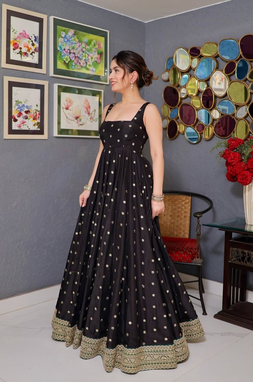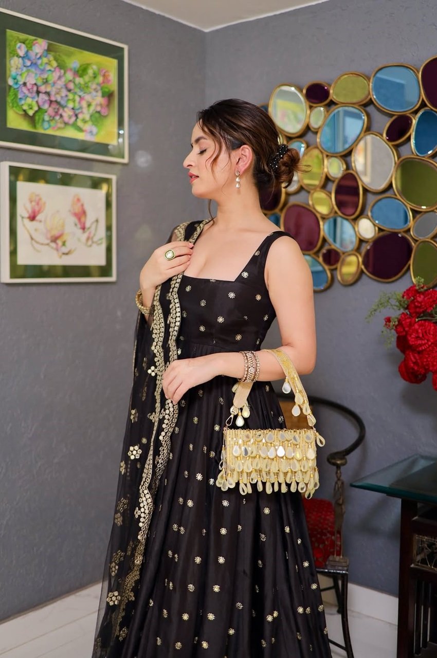 An exquisite ensemble crafted from luxurious silk fabric, adorned with heavy 5mm sequins and intricate thread embroidery. The kali-cut silhouette enhances the graceful flare, while the shimmering dupatta adds a touch of timeless elegance — perfect for festive occasions, receptions, and grand celebrations.