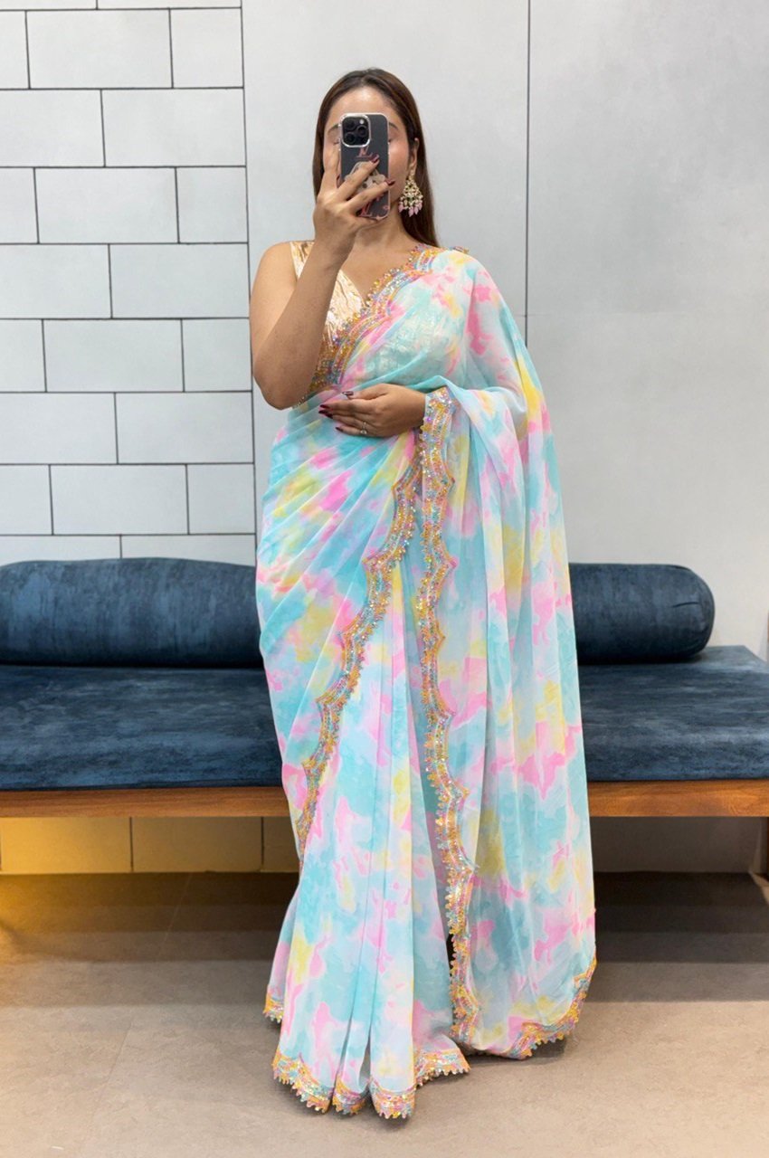 Step into elegance with this vibrant and airy saree, crafted to bring effortless grace to your wardrobe.