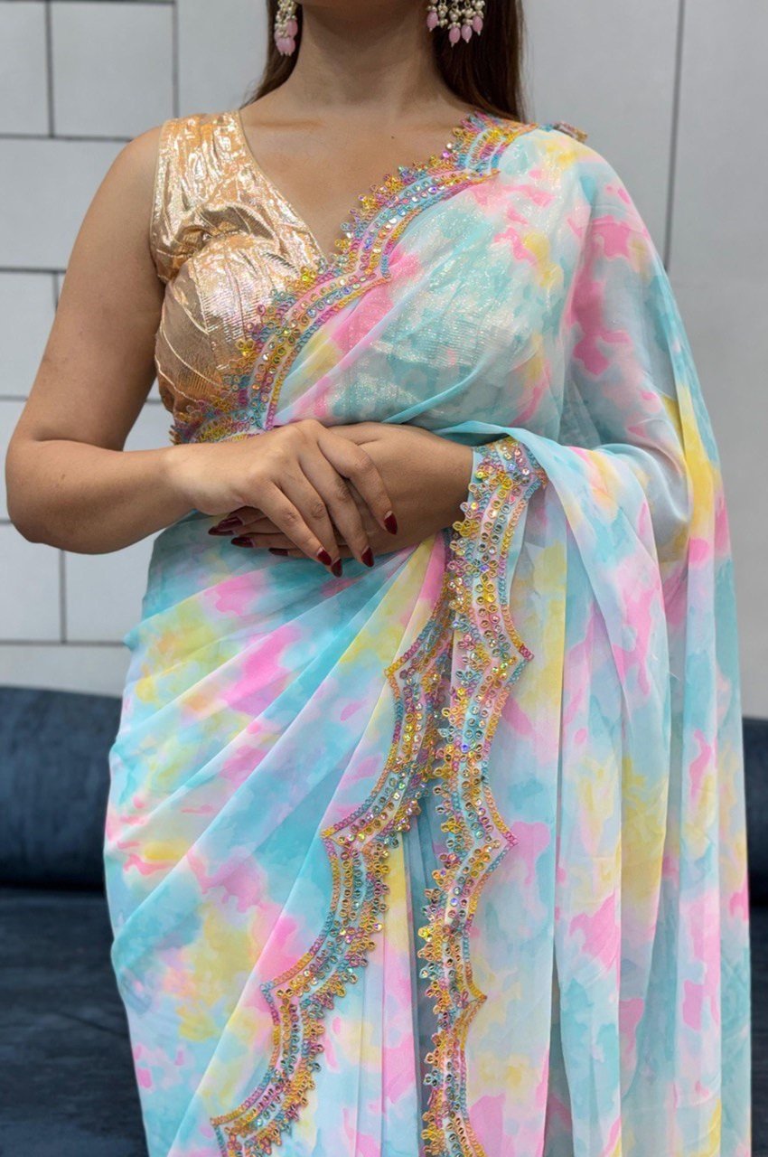 • Work: Highlighted with Cording Sequins Work and a stunning Super Rainbow 🌈 Lace Border for a festive, glam touch