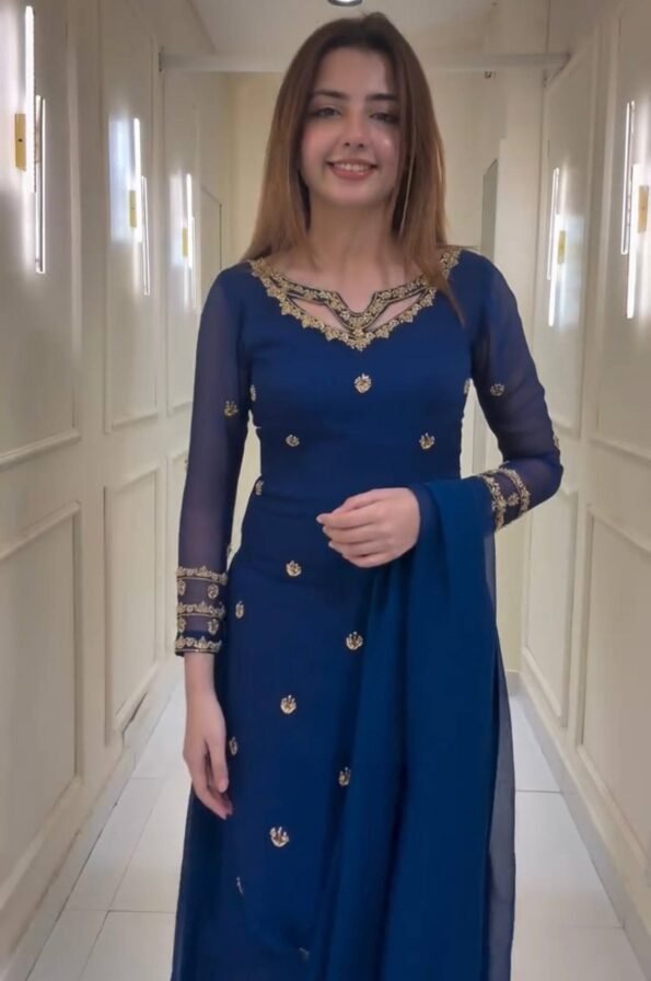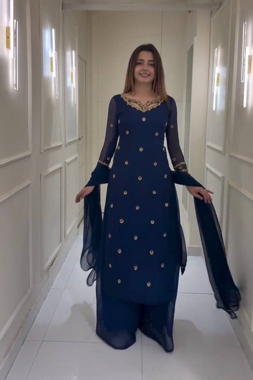 A chic and elegant three-piece set designed in soft faux georgette, highlighted with detailed embroidery and cut-work pattern. Perfect for festive wear, parties, and traditional occasions.