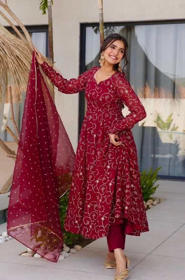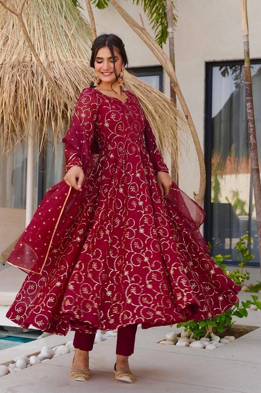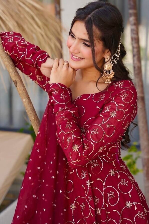 A graceful designer gown in premium faux georgette, beautifully adorned with intricate embroidery and sequence work. With a flowing 4-meter flair, soft micro cotton lining, and a matching embroidered dupatta, this set is perfect for weddings, parties, and festive occasions.