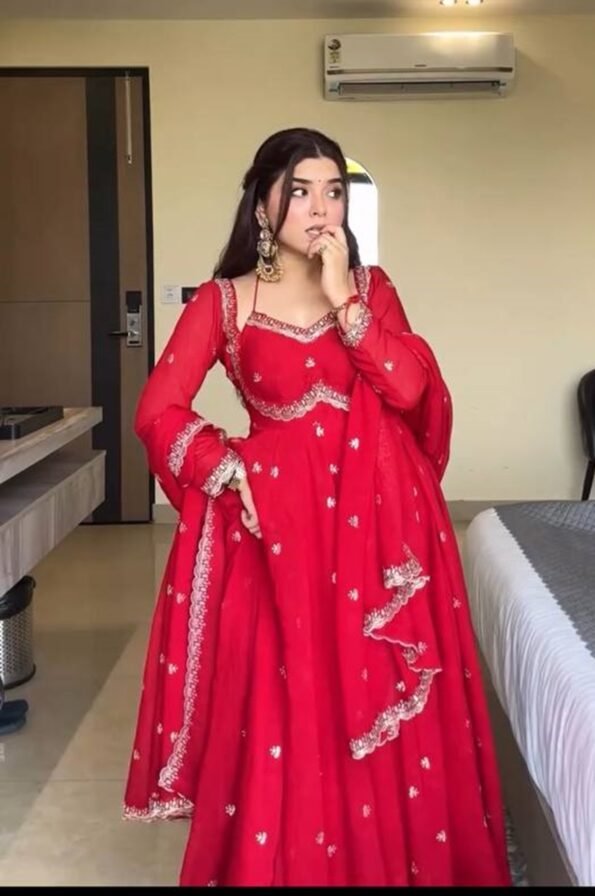A graceful Anarkali suit designed in flowy faux georgette with elegant thread and sequin embroidery. Paired with a comfortable micro cotton pant and a matching embroidered dupatta, this set makes a timeless choice for festive occasions, weddings, and parties.